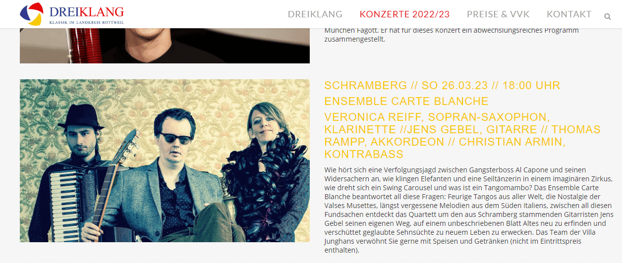 Das wäre gut, denn in einem Flyer für ein Jazz-Konzert mit Jens Gebel im Rahmen der Dreiklangreihe steht die Ankündigung, das Konzert werde in der Villa Junghans stattfinden – und das Team der Villa sorge für das leibliche Wohl.