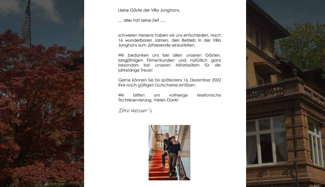 „Schweren Herzens“ so die Weissers auf ihrer Homepage, hätten sie sich entschieden, zum Jahresende den Betrieb in der Villa Junghans einzustellen, „nach 16 wunderbaren Jahren“, wie sie betonen.