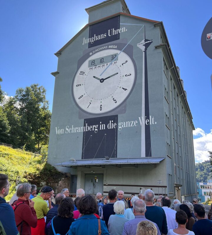 Als stolzes „Aushängeschild“ für eine Schramberger Uhreninnovation grüßt die Junghans MEGA in einer Wandmalerei der Firma Albrecht Werbetechnik aus dem Jahr 1991 den Autoverkehr auf der B 462.