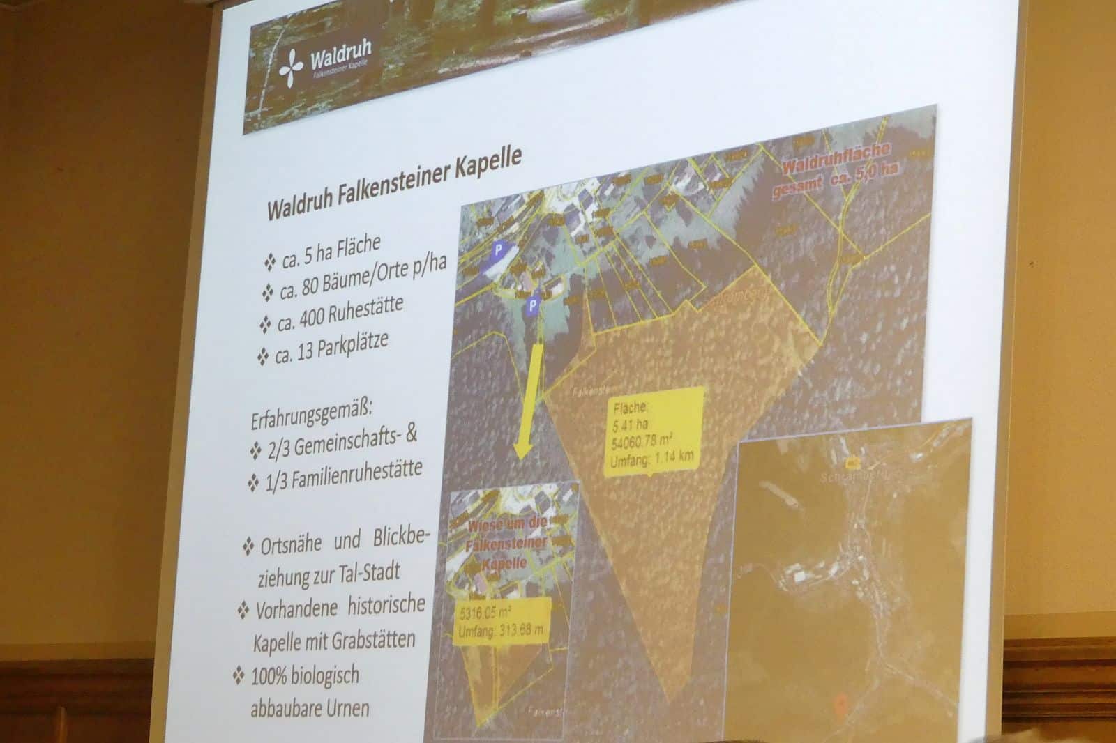 Im Wald oberhalb der Falkensteiner Kapelle möchte der Waldbesitzer, die Familie Bissingen, einen Bestattungswald einrichten. In einem komplizierten Rechtsverhältnis zwischen Stadt und der Familie Bissingen bliebe die Stadt weiterhin Friedhofsträger. Der Ausschuss für Umwelt und Technik (AUT) hat mit deutlicher Mehrheit einen entsprechenden Empfehlungsbeschluss abgegeben.