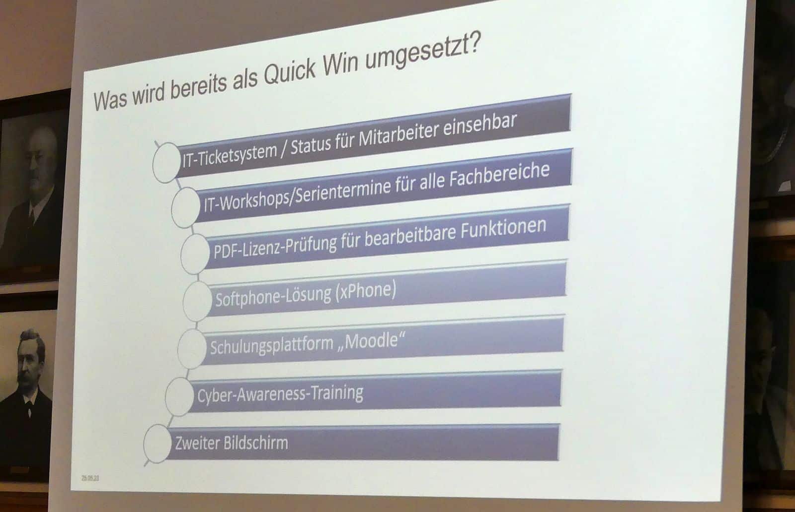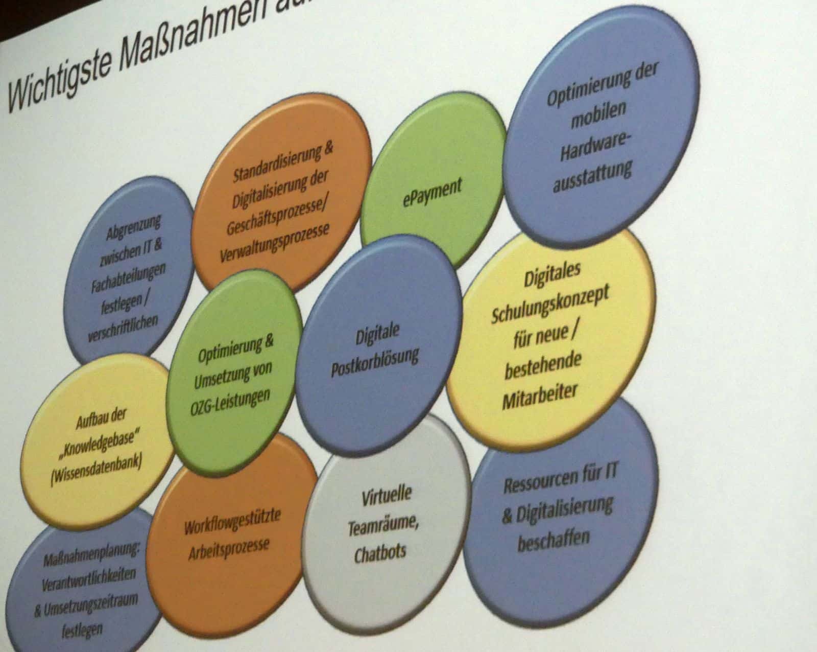 Aus ihrer Sicht wären die wichtigsten Maßnahmen die Klärung von Zuständigkeiten und der Aufbau einer Wissensdatenbank. Verantwortlichkeiten müssten festgelegt werden, Verfahren standardisiert und das elektronische Bezahlen ermöglicht werden. Digitale Postfächer und mobile Hardwareausstattungen standen ebenfalls auf Süß‘ Liste.