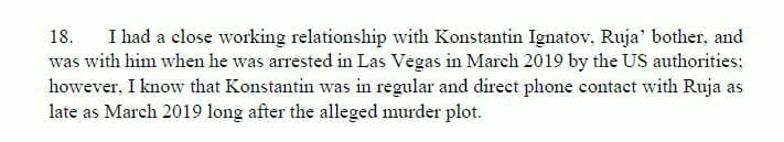 Und was sagt Duncan Arthur? Jahrelang war er einer der wichtigsten Manager im OneCoin-Imperium und Freund von Konstantin Ignatov: „Ich hatte eine intensive Arbeitsbeziehung zu Konstantin Ignatov.“ Er sei mit ihm in Las Vegas gewesen und war dabei ,als ihn die US-Behörden am 8. März 2019 in Los Angeles verhaftet haben. „Auf jeden Fall weiß ich, dass Konstantin im regelmäßigen und direkten Telefonkontakt mit Ruja stand und zwar noch im März 2019, also lange nach dem angeblichen Mordkomplott.“ (… however, I know that Konstantin was in regular and direct phone contact with Ruja as late as March 2019 long after the alleged murder plot.“)
