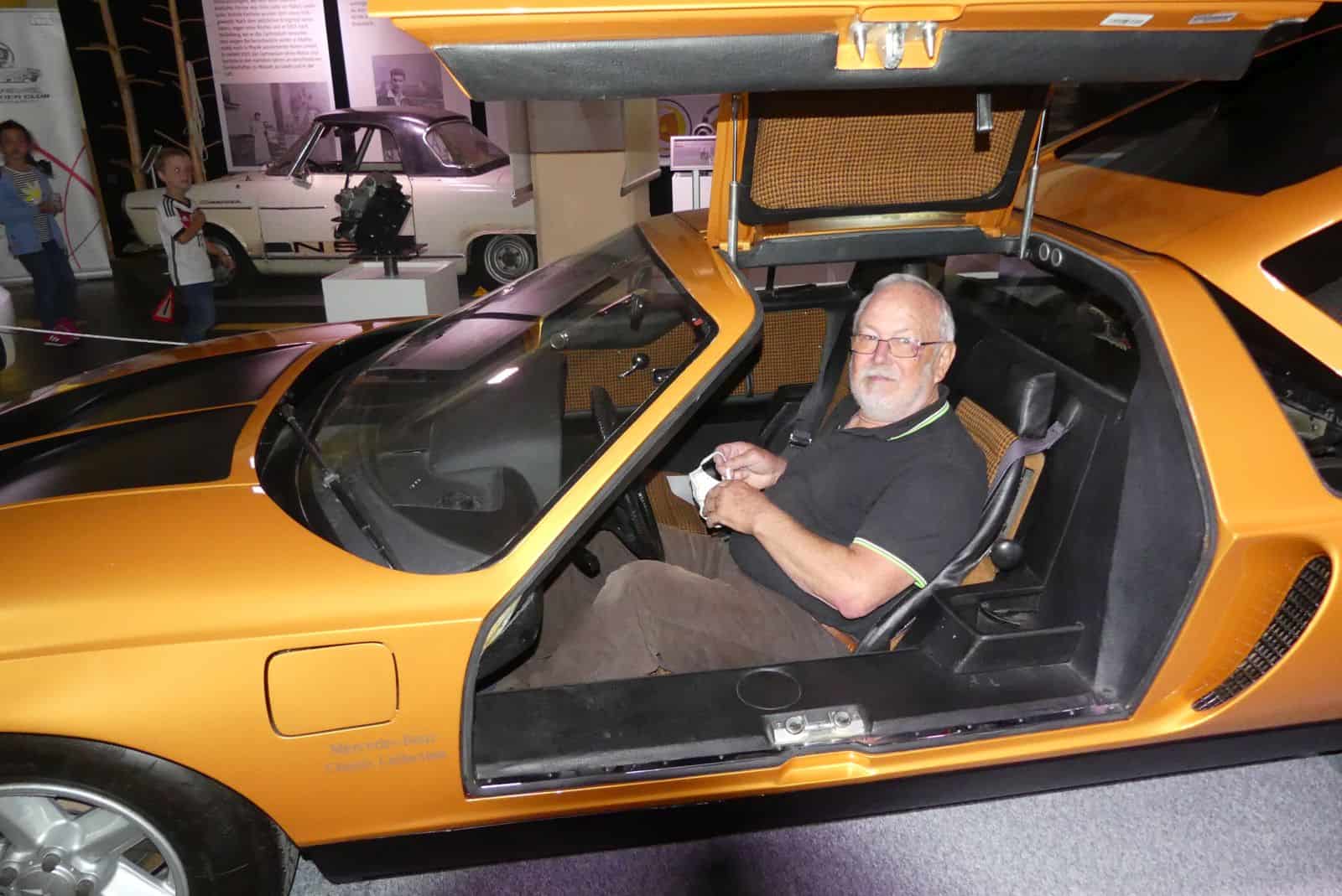 Zurück ins Museum: Dieter Botzenhardt, der als junger Mann in Böblingen an der Entwicklung des damals revolutionären Mercedes-Benz C 111 in Böblingen beteiligt war, zwängt sich durch die Flügeltür hinter das Lenkrad. „Ich habe den damals zum TÜV in Böblingen gefahren“, erinnert er sich.