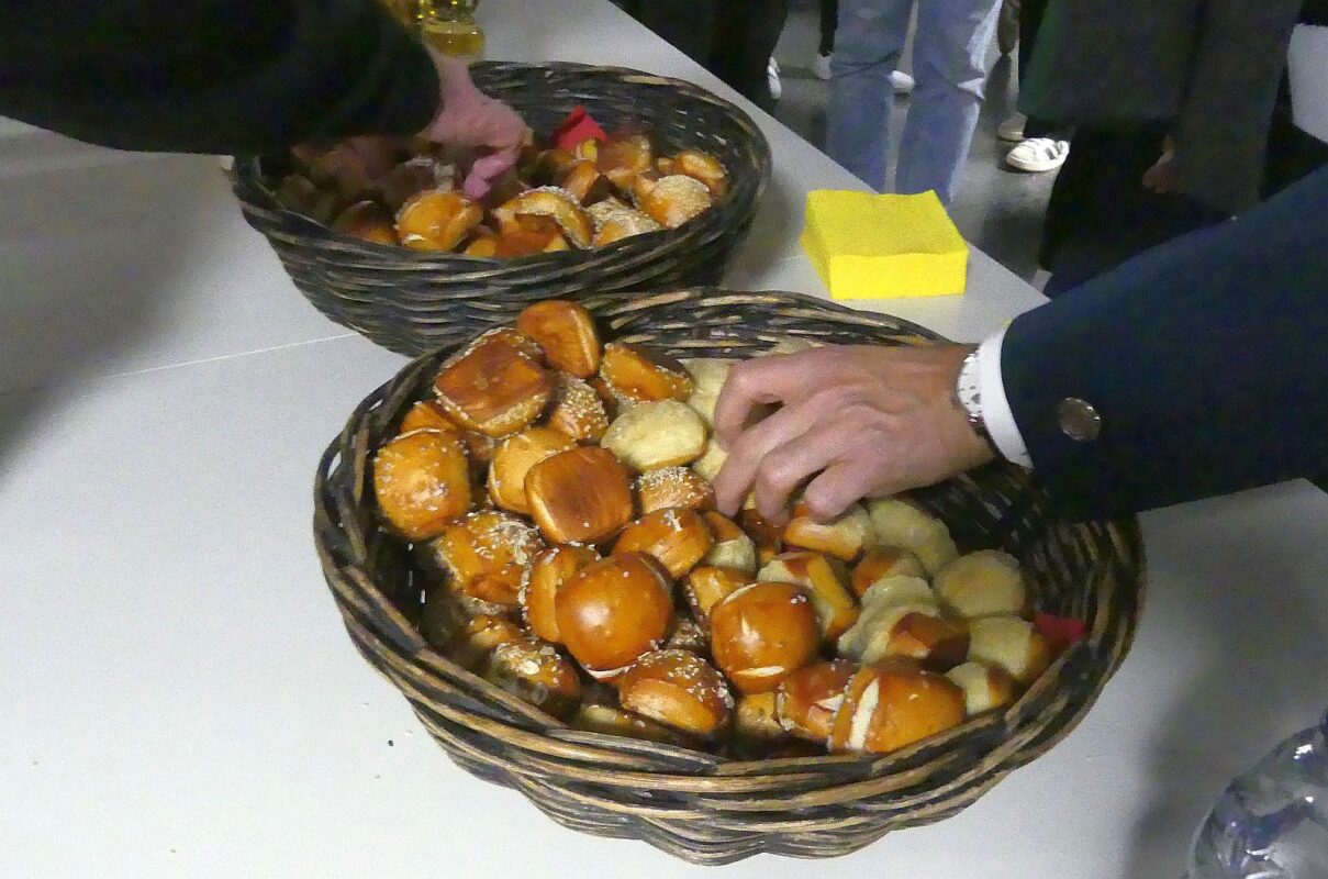 Nach einem Vortrag von Sandra Paruszewski über ihre Karriere als Ringerin (wir werden noch berichten), gab es der städtischen Haushaltslage angepasst, ein deutlich eingeschränktes Angebot an Getränken. Statt Häppchen hatte die Stadt sprichwörtlich kleine Brötchen backen lassen. Die Sportlerinnen und Sportler unterhielten sich dennoch gern und lange im Foyer, musikalisch begleitet von Samuel Bantle.