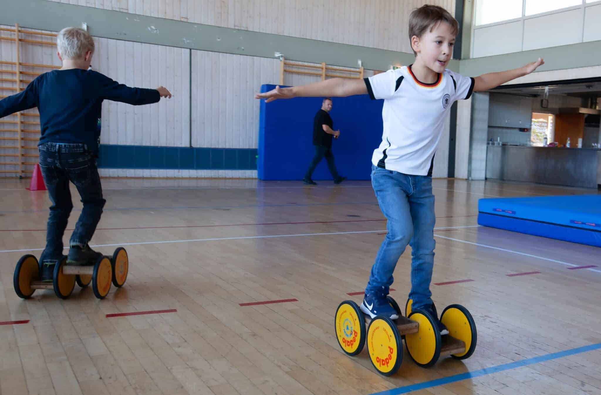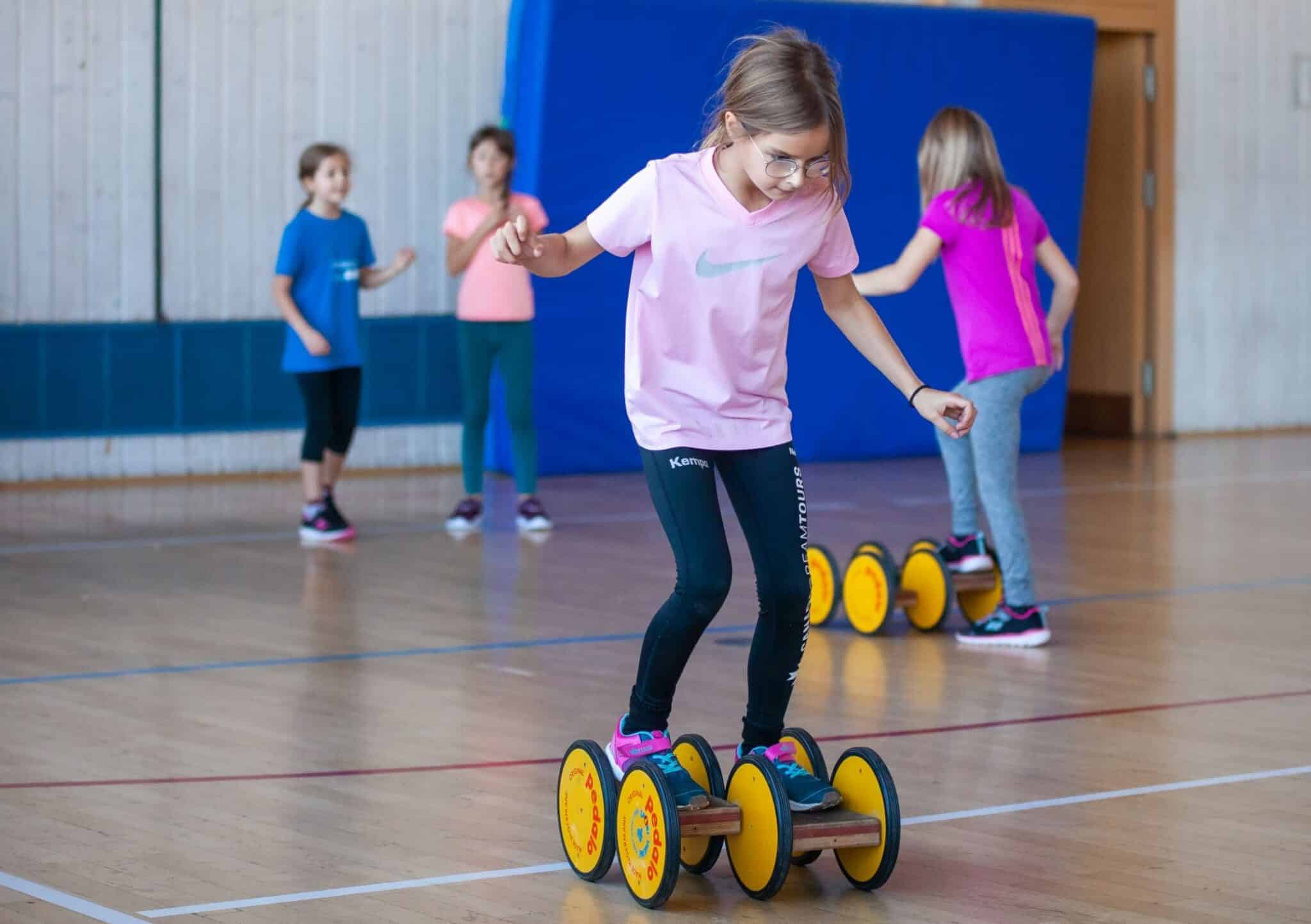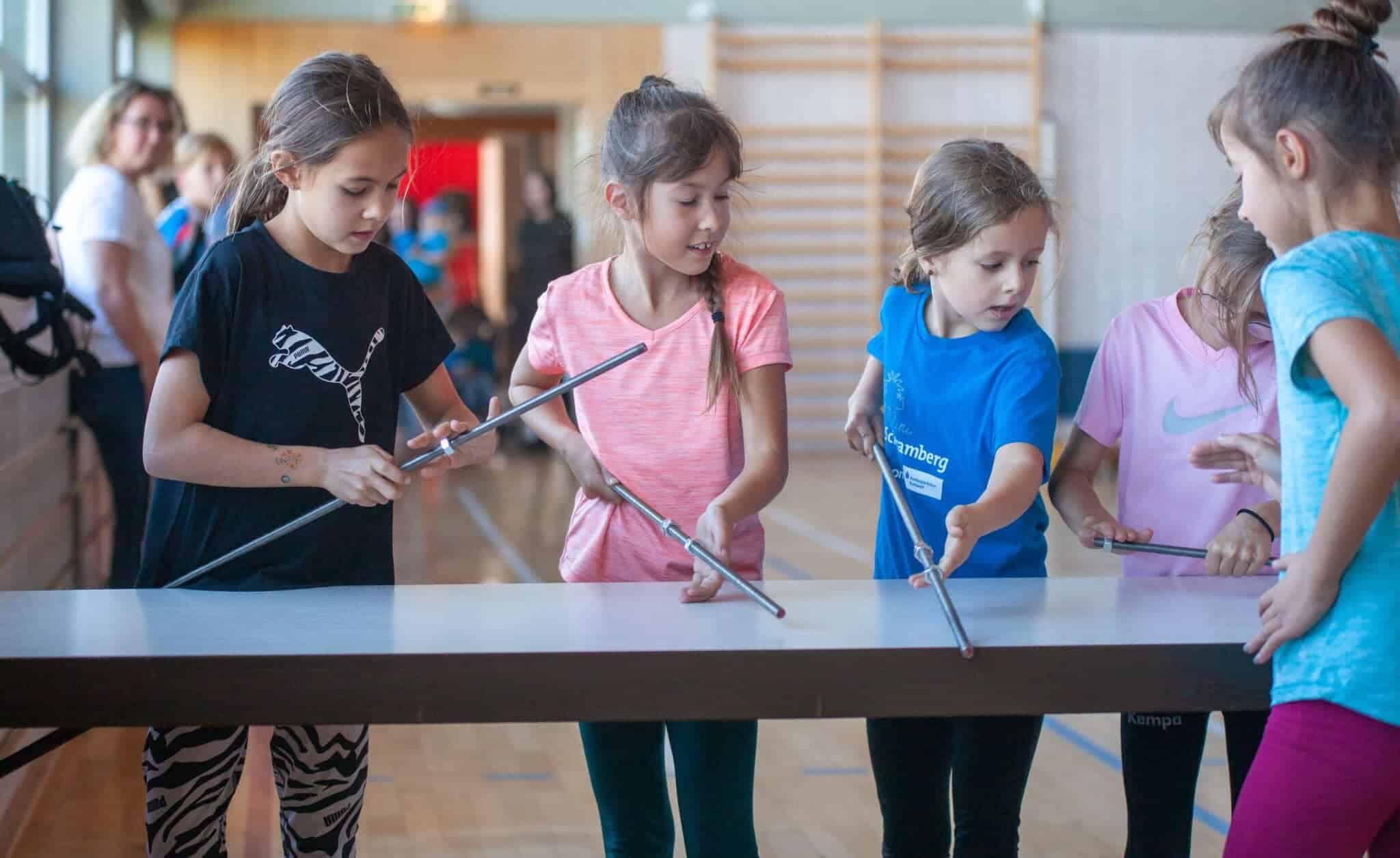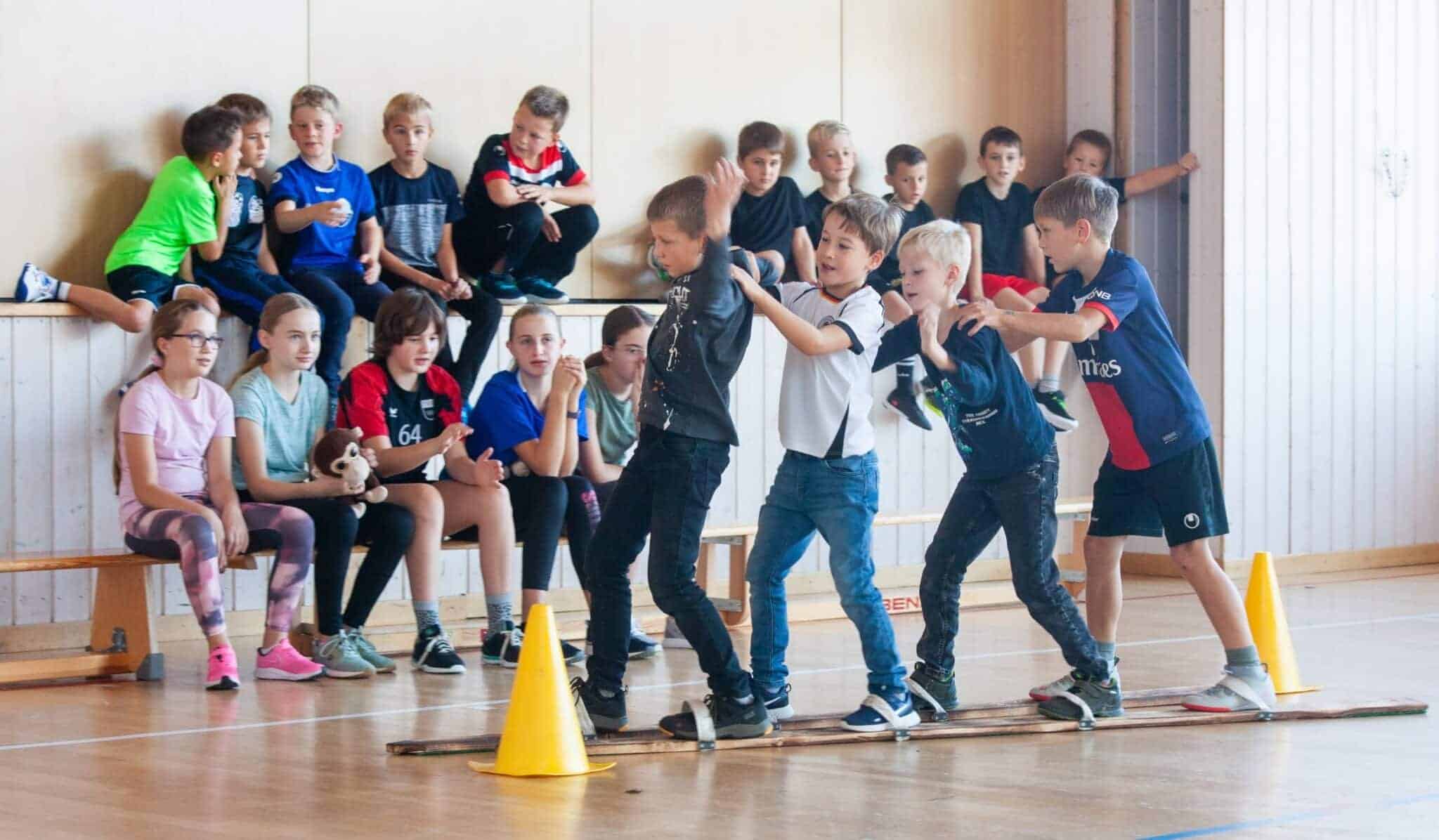 Aus dem angesagten Kinder-Biathlon entwickelte sich jedoch ein Sechs-Stationen-Wettkampf, bestehend aus „An einer Eisenstange die Schraube runterdrehen“, „Zielwerfen mit Tennisbällen“, „auf zwei langen Skiern als Team eine Slalomstrecke durchschieben“,“mit einem Besen und Holzklötzchen Eisstock schießen“, „Pedalo treten über eine Strecke von 20 Meter mit Wendepunkt“ und zuletzt „als Gruppe gemeinsam auf eine große Weichbodenmitte springen und diese an die Sprossenwand schieben.“