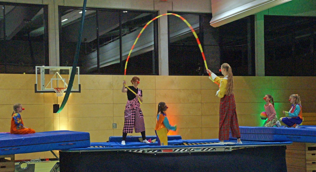 Dann durfte zum ersten Mal das Aufbauteam der Sportgemeinde Deißlingen ran: Das Großtrampolin in die Hallenmitte schieben und zur Sicherung Weichbodenmatten dazulegen. Denn der Turnverein Oberndorf hatte sich mit vier Turnerinnen – die Clown-Girls – zur Turnschau angemeldet. Die Mädels meisterten ihren Auftritt souverän, sogar als die musikalische Untermalung des Auftritts ausfiel. Diese Leistung bedachte das Publikum mit einem Sonderapplaus.