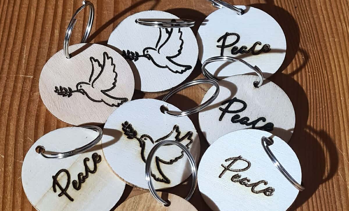 Eine Friedenstaube auf der einen Seite, das Wort "Peace" auf der anderen: Kleine Holzscheiben dieser Art verkauft der…