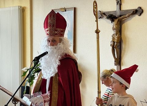 Gäste und Kirchenchor stimmten ein in das Lied „Lasst uns froh und munter sein“ und der prachtvoll gekleidete Nikolaus kam zu Besuch. Gekonnt hatte er Interessantes und Nachdenkliches zu berichten, insbesondere das Organisationteam erhielt auch viel Lob und Dank zugesprochen. Alle Anwesenden wurden danach mit einem Geschenk bedacht.