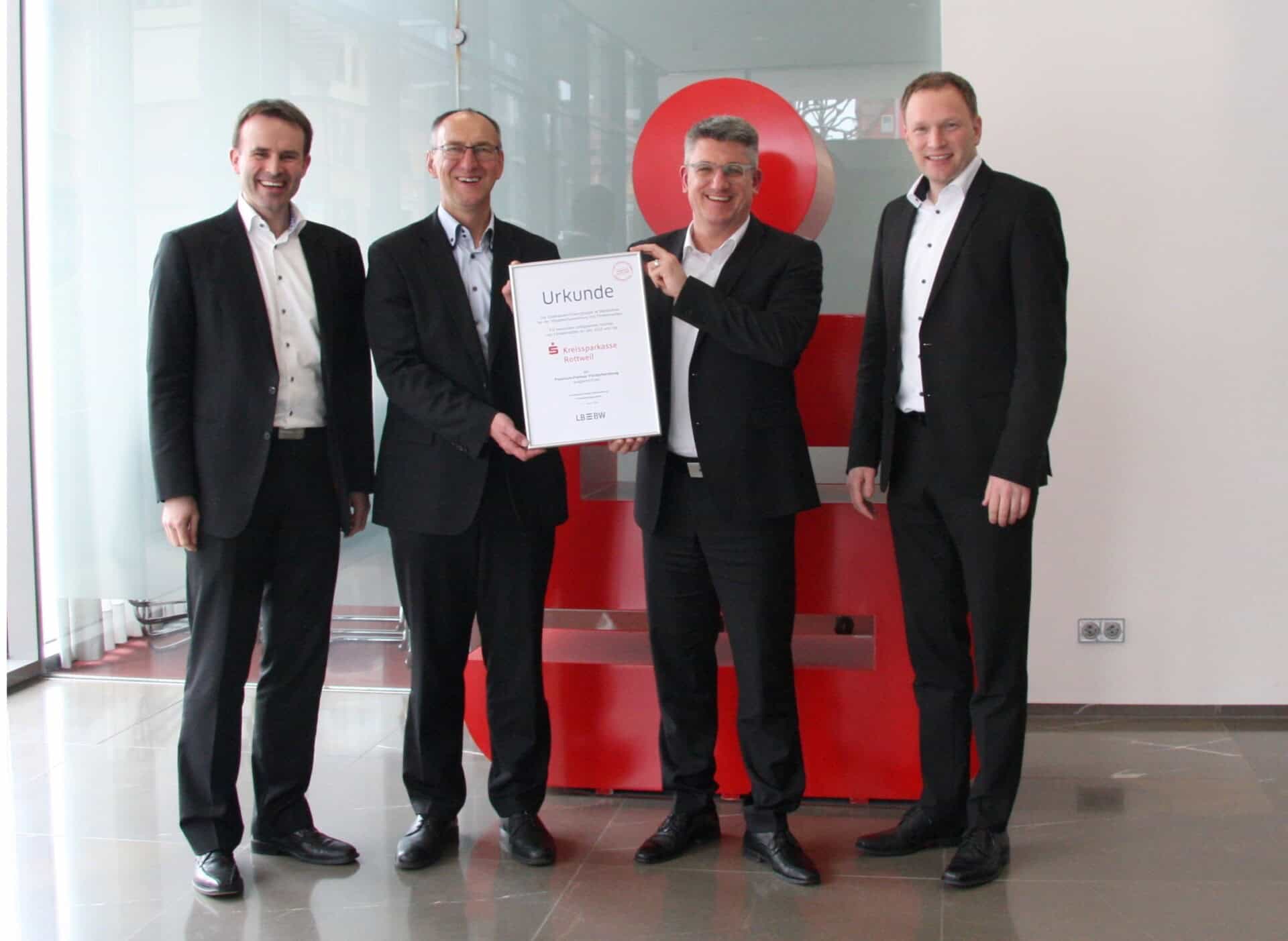 Frank Wenz, Leiter des Förderkreditgeschäfts bei der LBBW und sein Stellvertreter, Sascha Fürst, überreichten die Urkunde an die beiden Vertreter der Kreissparkasse, Christian Kinzel und Daniel Rühle, Direktor Unternehmenskunden und gratulierten zum hervorragenden Ergebnis.