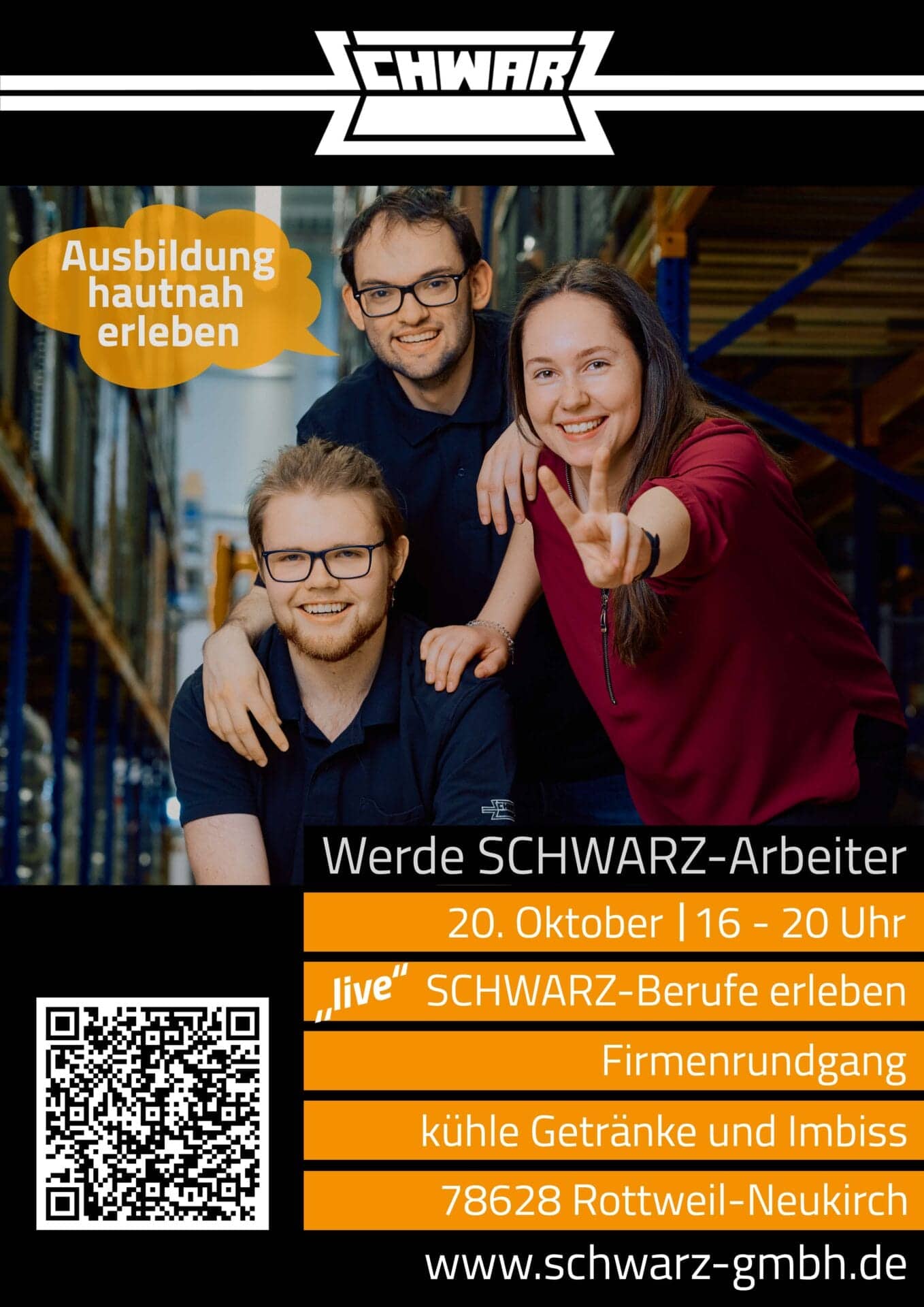 Wer Interesse hat, einen Blick ins Unternehmen zu werfen, hat dazu am Freitag, 20.10.2023 von 16 bis 20 Uhr die Gelegenheit. Nach dem Motto „Ausbildung hautnah erleben“ öffnet Schwarz die Türen und gibt Einblicke in alle Ausbildungsberufe direkt vor Ort (Zepfenhaner Straße 35 in Rottweil-Neukirch). Bei anschließenden Snacks und Getränken stehen Auszubildende und Ausbilder für Informationen zur Verfügung. Eine Anmeldung ist hier möglich, doch auch ohne vorherige Anmeldung sind alle herzlich willkommen.
