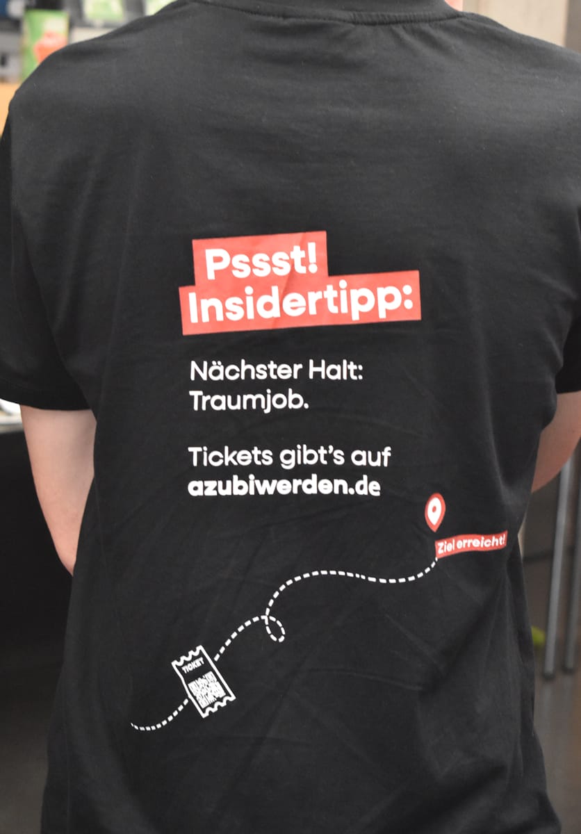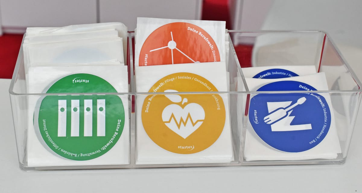 Die Organisatoren stellten verschiedenfarbige Buttons bereit. Mit ihnen können die Jugendlichen signalisieren, für welches Berufsfeld sie eich am meisten interessieren. Und wer sich noch ganz unsicher war, hatte eben mehrere Buttons auf dem T-Shirt.