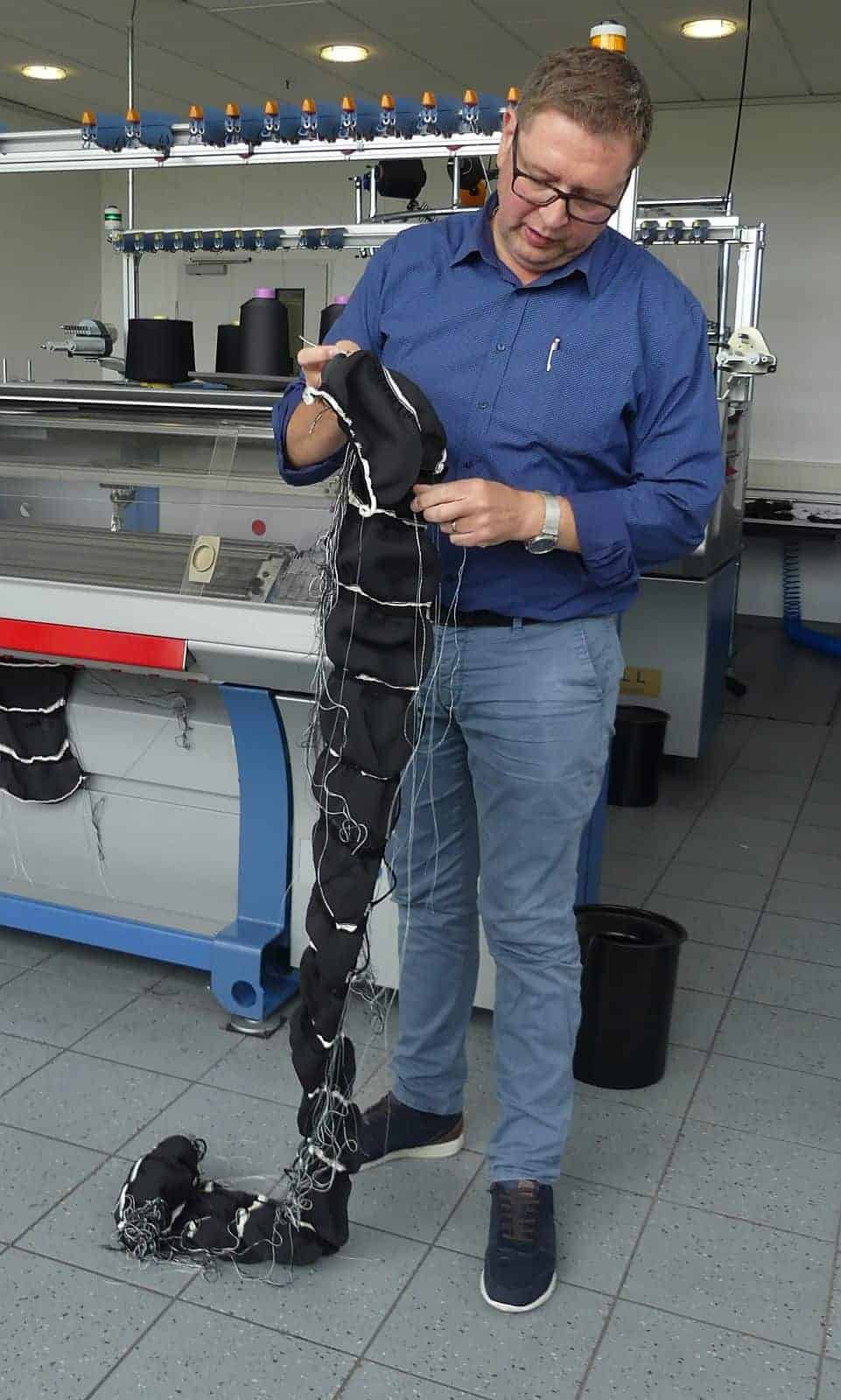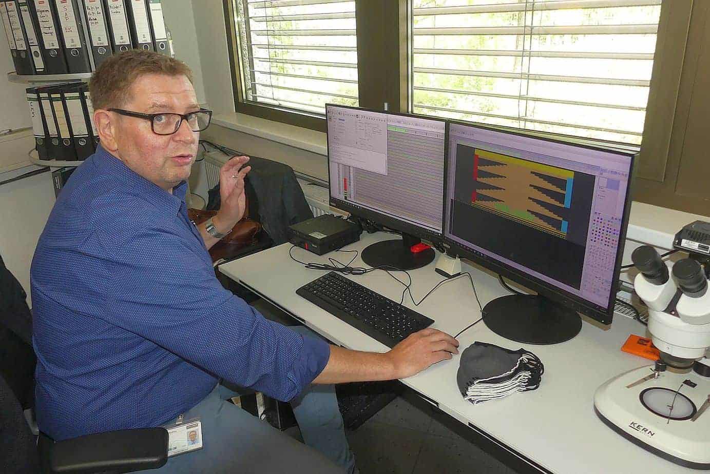 „Wir haben hier zwei Strickmaschinen für unsre Tests“, erzählt der gebürtige Niederländer Waulthers. „Als dann die Coronakrise kam, und überall Mundschutzmasken fehlten, haben wir überlegt, da könnten wir die Maschinen doch fürs Mundschutzfertigen einsetzen.“