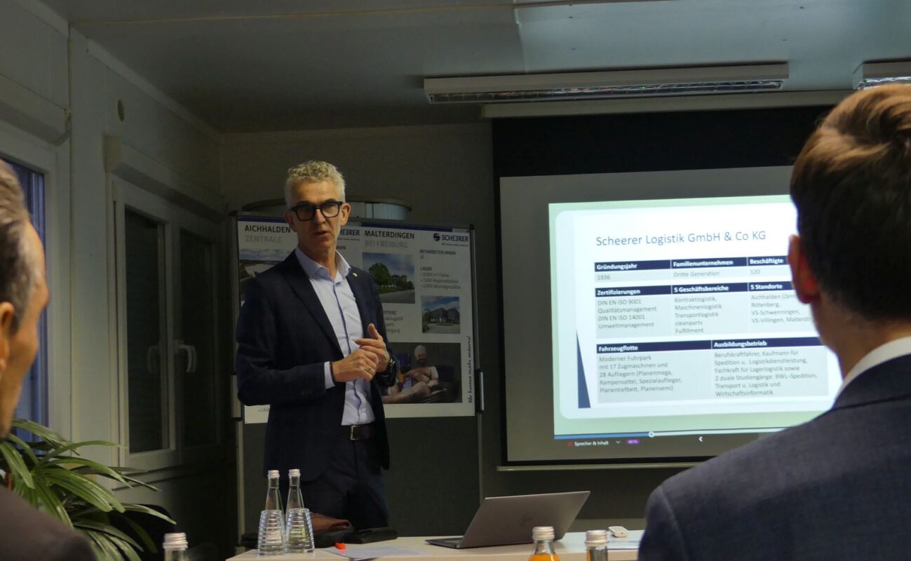 Achim Scheerer stellte den Gästen zunächst sein Unternehmen vor, das sein Großvater 1936 gegründet hatte. Heute beschäftige er 120 Mitarbeiterinnen und Mitarbeiter an vier Standorten. Neben der Transportlogistik betreibt Scheerer auch Lagerlogistik, Maschinenhandling, die Verpackung, den Transport und die Remontage von Maschinen und Anlagen weltweit.