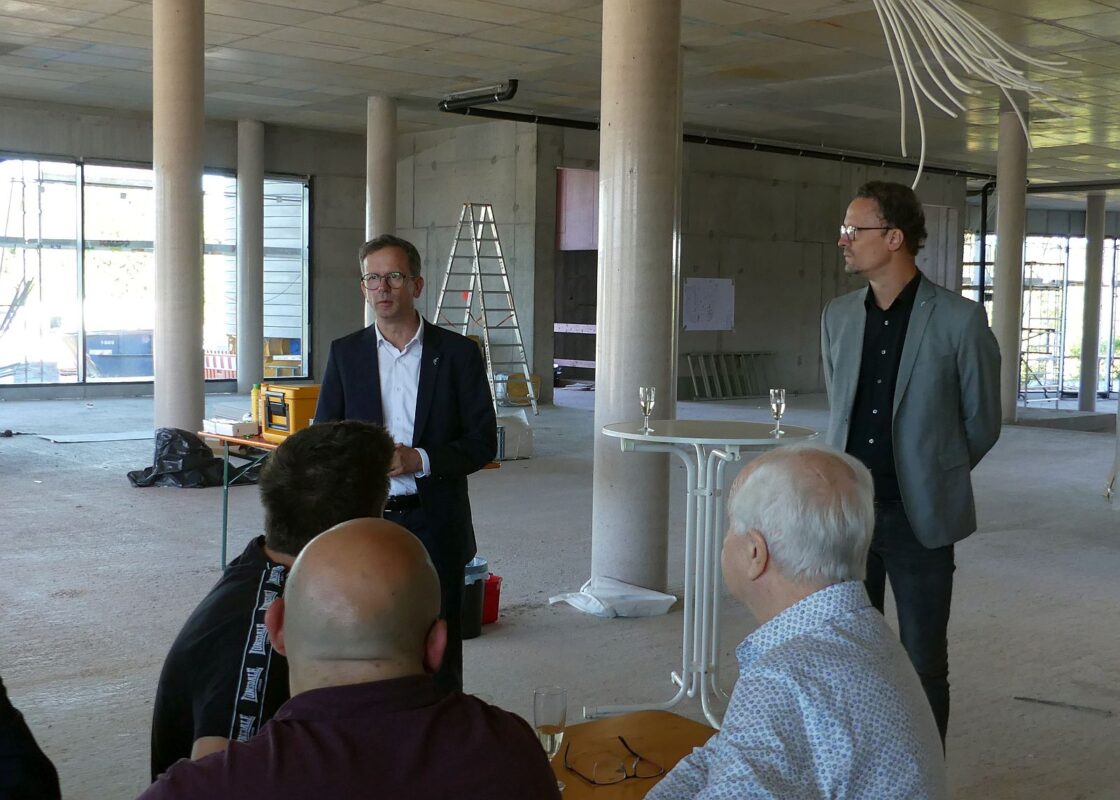 Auch er freute sich, dass man komplett im Zeit- und Kostenplan liege. Der „Traum auf dem Papier“ nehme nun „Stück für Stück Gestalt an“, so Maurer. Im vergangenen Oktober habe die Firma Bantle 7000 Kubikmeter Erdboden bewegt. Für den Rohbau seien 4000 Kubikmeter Beton verbaut worden. Weitere 425 Tonnen Stahl kamen als Bewehrungsstahl in decken, Wände und Stützen hinzu. Maurer bedankte sich bei den Nachbarn für ihr Verständnis: „Ein solcher Bau geht nicht ohne Geräusche, Verkehr und Dreck.“