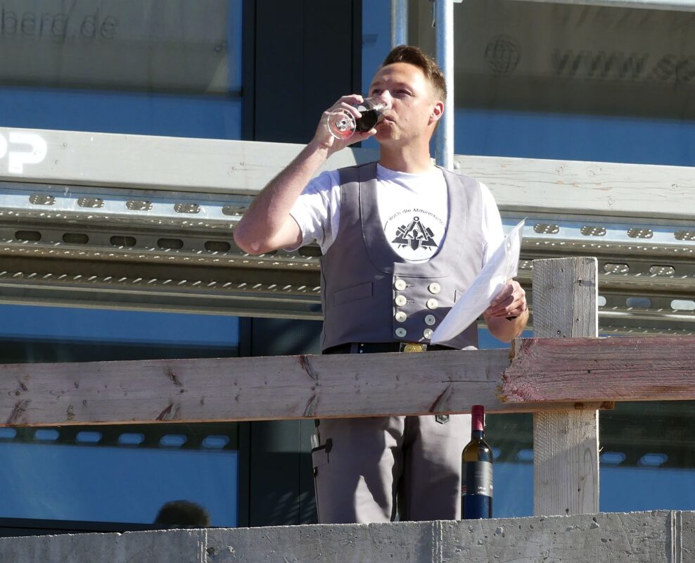Donnerstagnachmittag 16.02 Uhr: Auf einem Balkon oberhalb des künftigen Eingang der neuen „Homebase“ der Firma Maurer hat Tim Bucher Position bezogen. In grauer Maurerkluft, ein Weinglas in der rechten, ein Manuskript in der linken Hand setzt er zum Richtspruch an und bemerkt: „Das ist die erste Verspätung.“