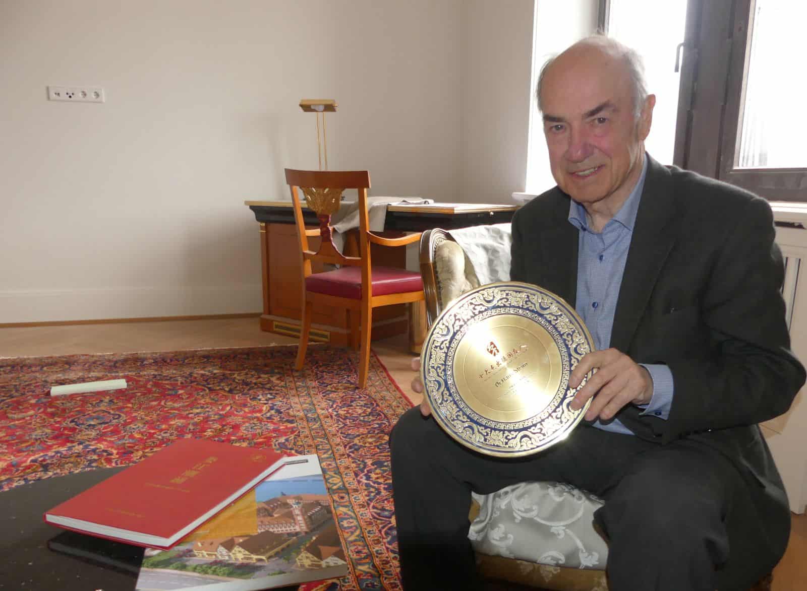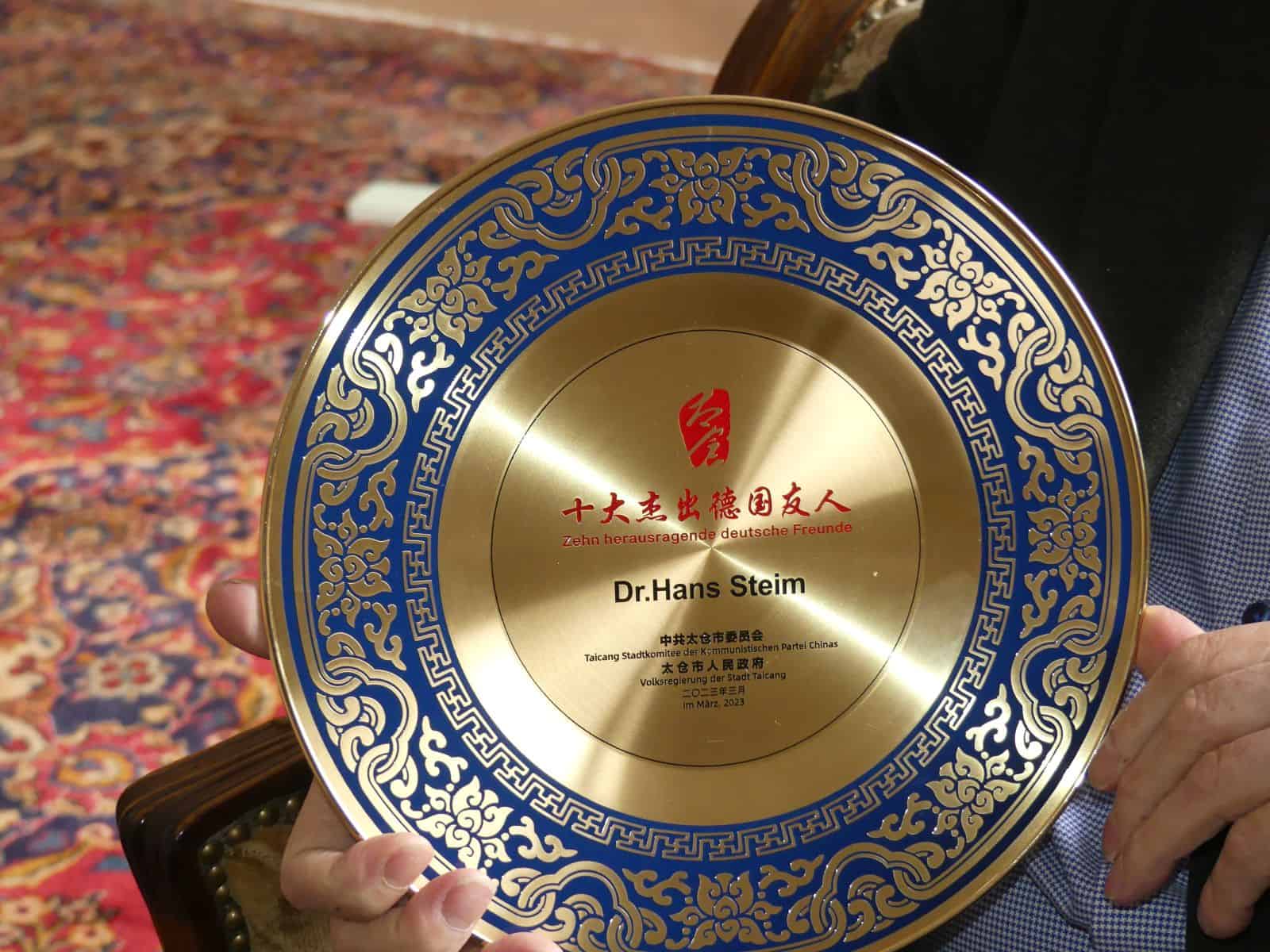 Es ist ein Land, vor allem aber die Stadt Taicang, das mir ans Herz gewachsen ist, und ich beobachte die Entwicklung mit Freude, aber auch mit Sorgen. Ich war ein Teil der Entwicklung, bin es vielleicht heute noch etwas, und ich bin stolz auf diese Entwicklung. Für meinen langjährigen Einsatz bin ich als „einer der 10 hervorragenden Freunden“ von der Kommunistischen Partei und der Volksregierung der Stadt Taicang mit einem Teller geehrt worden.