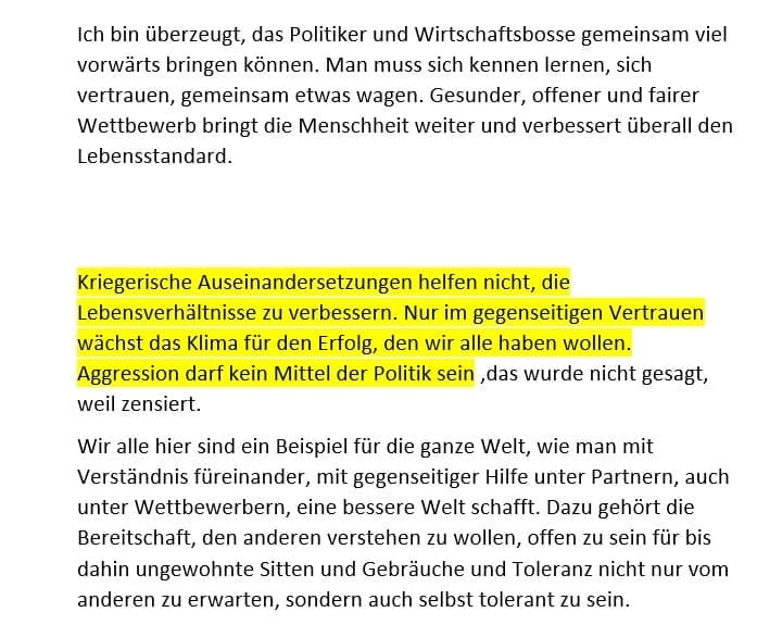 Ja, ich habe dort eine Rede gehalten, die ich vorab zum Übersetzen geschickt habe. Und sie haben tatsächlich eine Passage, in der ich vor Krieg gewarnt habe, herausgeschnitten oder nicht übersetzt. Es wurde mir auch gesagt, dass ich das nicht sagen solle. Ich habe auch nicht provoziert und diese drei Sätze nicht gesagt.