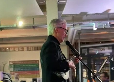 Finnern selbst griff einmal mehr zur Ukulele und in die Liederkiste. Er eröffnete den Abend mit Nina Hagens „Du hast den Farbfilm vergessen“, die traurige Ballade vom Ausflug ans Meer und hinterher ist alles nur schwarzweiß Finnern wundert sich, dass etliche der Zuhörer das Lied gar nicht kannten. (Wer Nina Hagen sich anschauen mag – bitte sehr.)