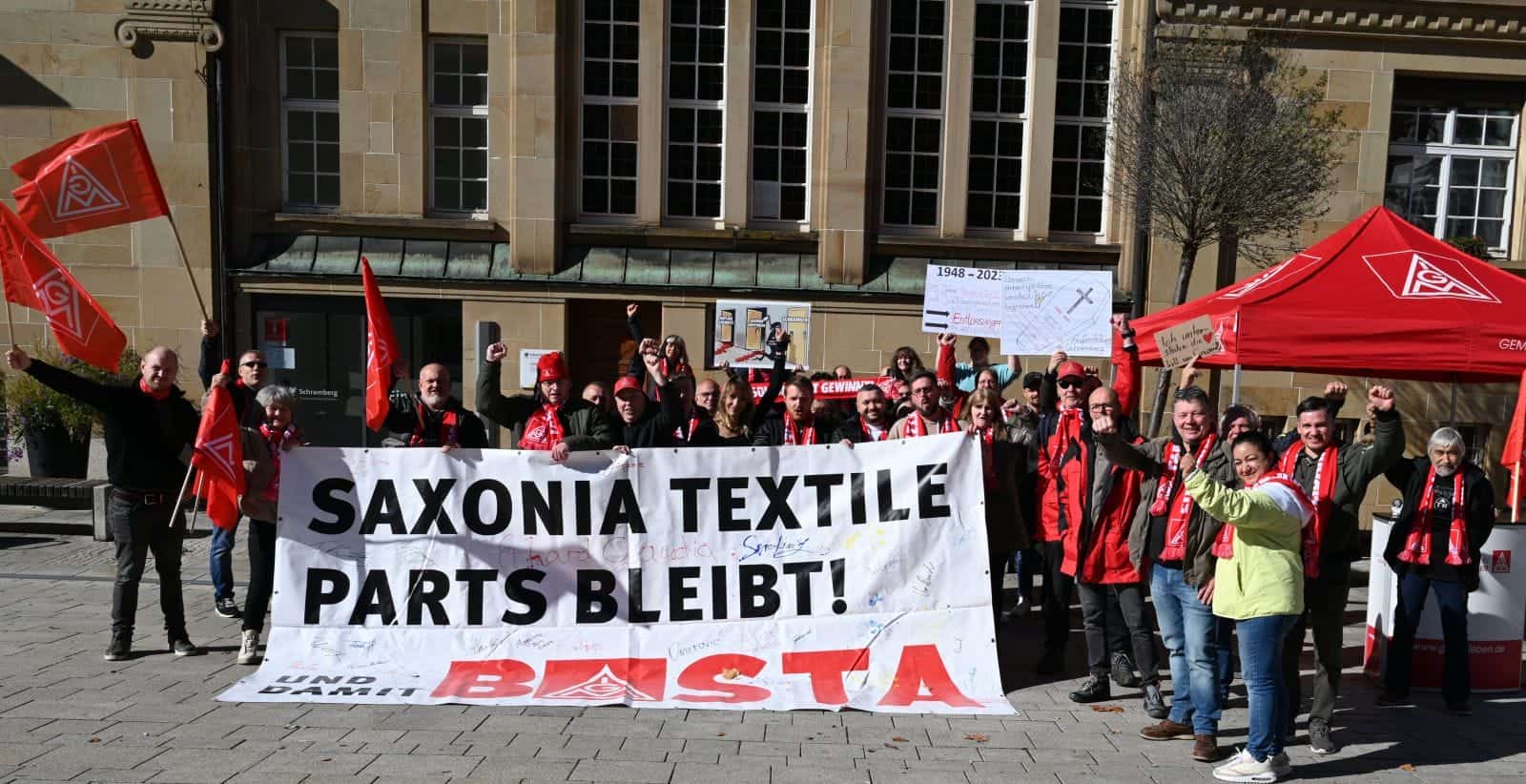 Die Schließung von Saxonia Textile Parts in Göppingen sei „eine eigenartige Form, seine Dankbarkeit auszudrücken“, schreibt die IG Metall in einem Flugblatt. Bei einer Aktion am Morgen in Sulgen bei Kern-Liebers hatten die Streikenden dieses Flugblatt an die dortigen Kolleginnen und Kollegen verteilt.