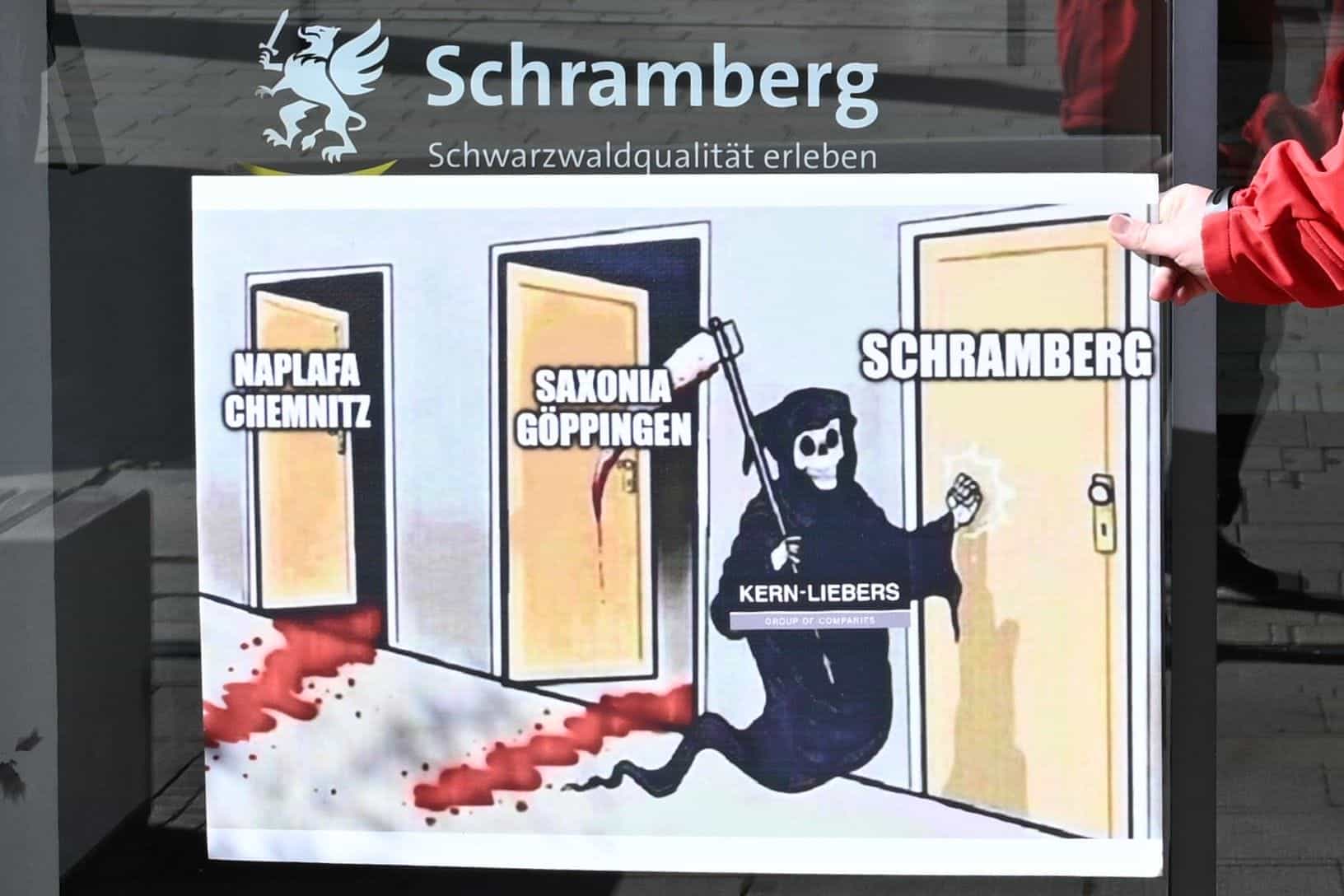 In einer Karikatur auf einem Plakat zieht ein „Schließungs-Gespenst“ von Naplafa in Chemnitz über Saxonia zu Kern-Liebers nach Sulgen. Damit spielt sie auf die drohende Gefahr auch hier an – und kritisiert die bisher eher schwache Unterstützung bei ihrem Kampf um ihre Arbeitsplätze durch die Kolleginnen und Kollegen in Schramberg.