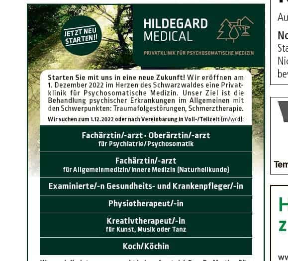 In einer Stellenanzeige in der örtliche Tageszeitung sucht die Medizinerin Dürr für ihre „Hildegard Medical“ genannte Privatklinik mehrere Fachärztinnen und –Ärzte für Psychiatrie, Innere und Allgemeinmedizin. Darüber hinaus möchte sie Pflegekräfte, Physiotherapeuten, Kreativtherapeuten und einen Koch oder Köchin einstellen.